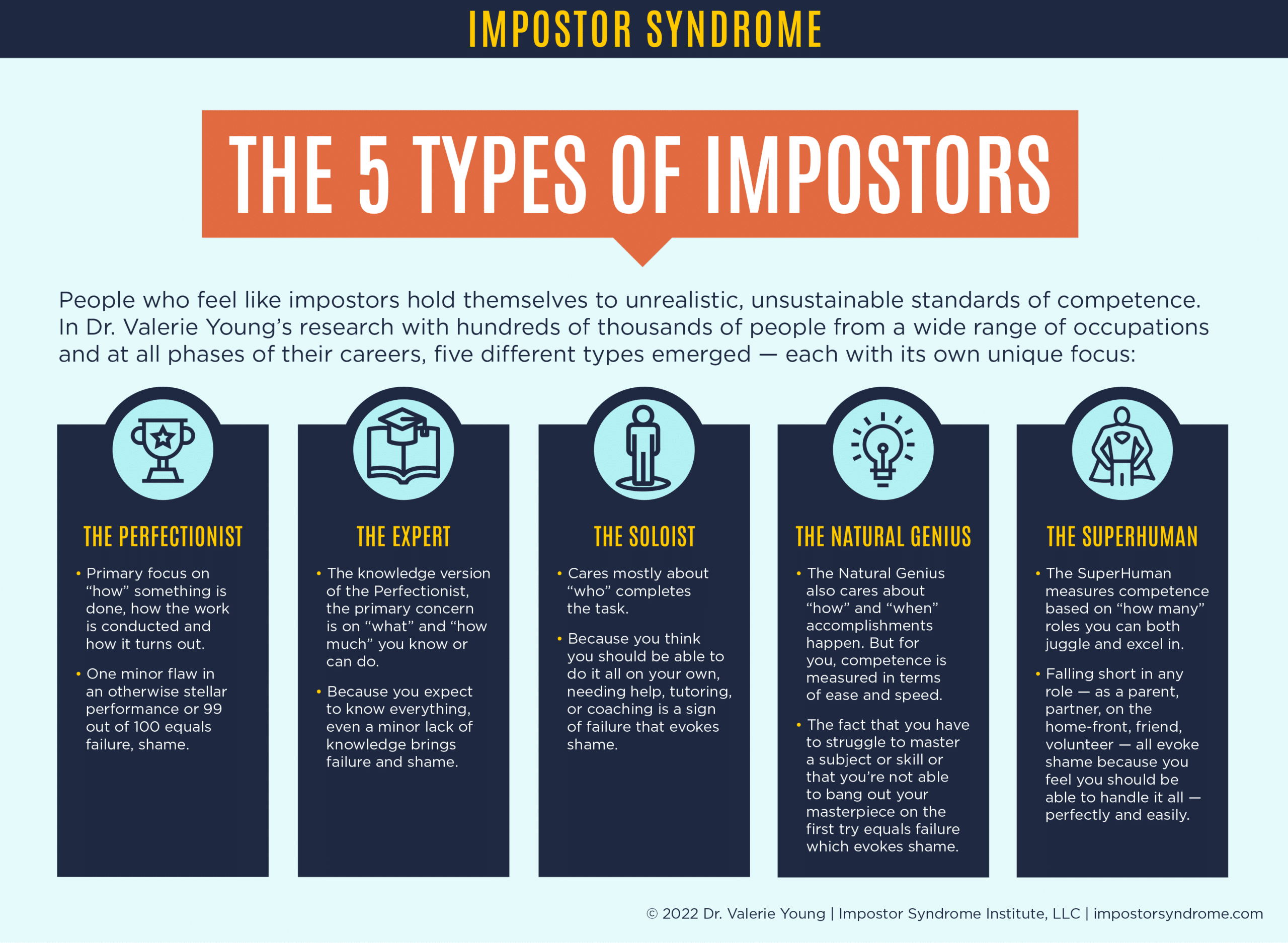 Dr. Valerie Young, founder of the Impostor Syndrome Institute, further divided impostor syndrome into five groups. You might relate to several of these; see which ones hit home the most.